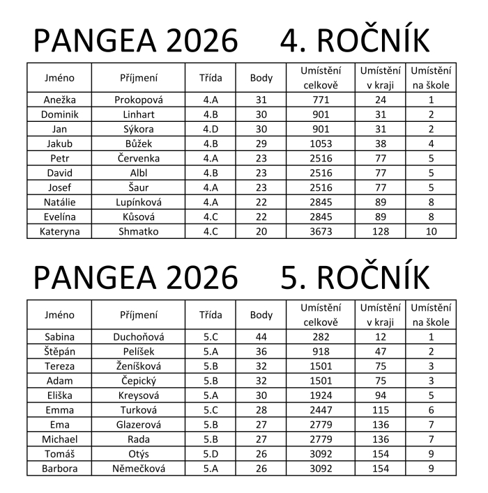 Letošního 13. ročníku matematické soutěže PANGEA se zúčastnilo 28 žáků 4. ročníku a 30 žáků 5. ročníku naší školy. Úkolem je řešení tematických matematických úloh. Pro letošní rok bylo zvoleno téma VESMÍR. Soutěž probíhá online školním kolem s postupem do kola finálového. Do finálového kola v Praze bohužel nikdo nepostoupil. V kraji získala Sabina Duchoňová z 5.C 12. místo z 5. ročníku a Anežka Prokopová ze 4.A 24. místo ze 4. ročníku. Ve škole obě získaly 1. místa.
