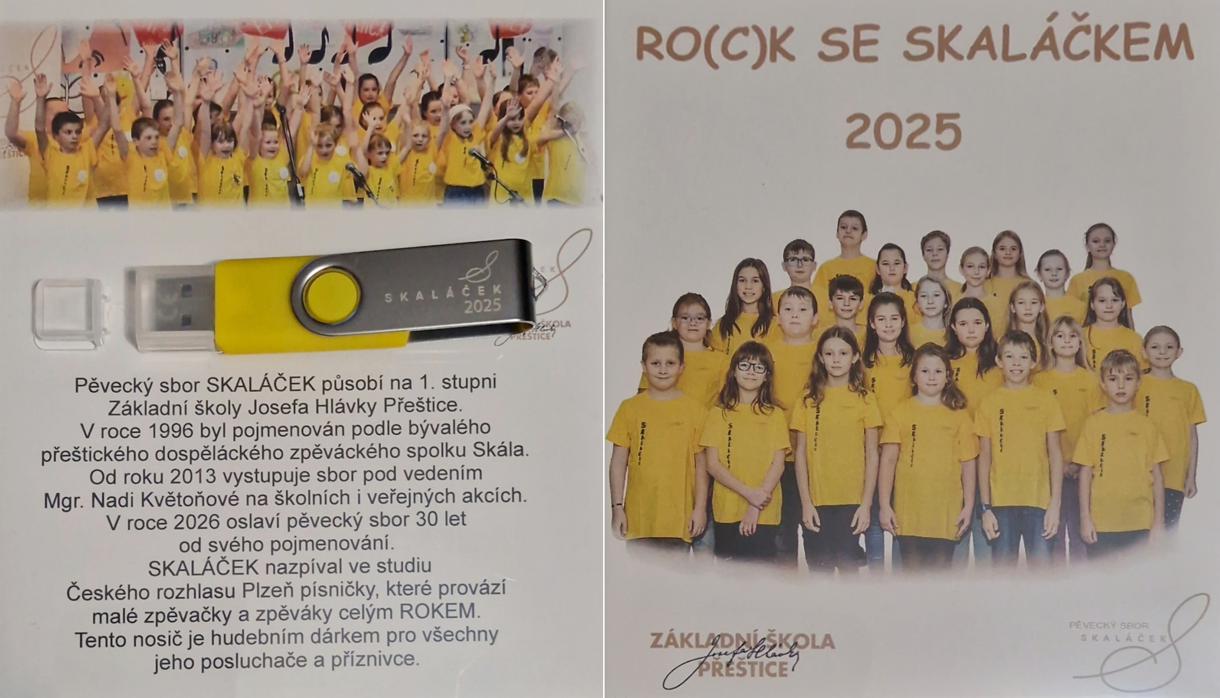 Jejich usilovná práce a nasazení se promítla i do natočení hudebního nosiče, který byl PŘEKVAPENÍM večera. Pěvecký sbor SKALÁČEK oslaví v roce 2026 již 30 let od svého pojmenování, proto jsme se rozhodli se současnou partou malých zpěvaček a zpěváků natočit repertoár písniček, které je provází celým ROKEM. Natáčecí den probíhal ve studiu Českého rozhlasu PLZEŇ a byl pro děti velkým zážitkem a zkušeností. Náš hudební nosič jsme pokřtili na vánočním koncertu, kde z něj zaznělo několik písniček. RO(C)K se SKALÁČKEM, jak se nazývá hudební nosič, si můžete zakoupit během roku na vrátnici budovy 1.stupně ZŠ za 250 Kč. Nyní je "horkou" novinkou před vánočními svátky.